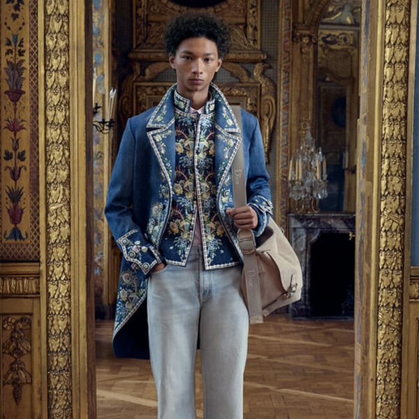 Plus, he looks past Monsieur’s famous love of Britain to America, seen in meters of denim, cut into tailcoats or used in paneled jeans. Think Yellowstone cowboy in Versailles.