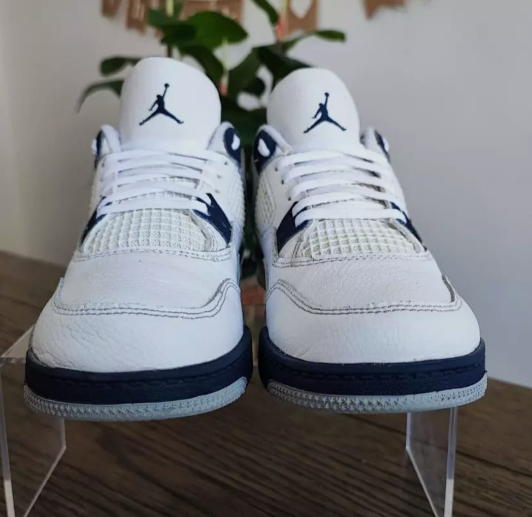 The Air Jordan 4 Retro – White & Midnight Navy brings back one of Jordan Brand’s most celebrated silhouettes, reimagined with luxury materials and streetwear precision. ✨