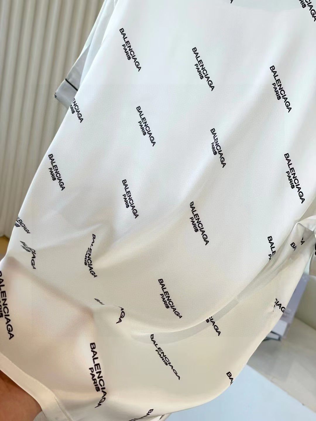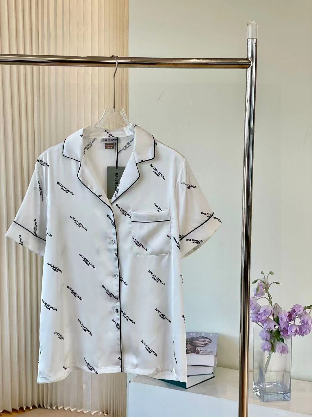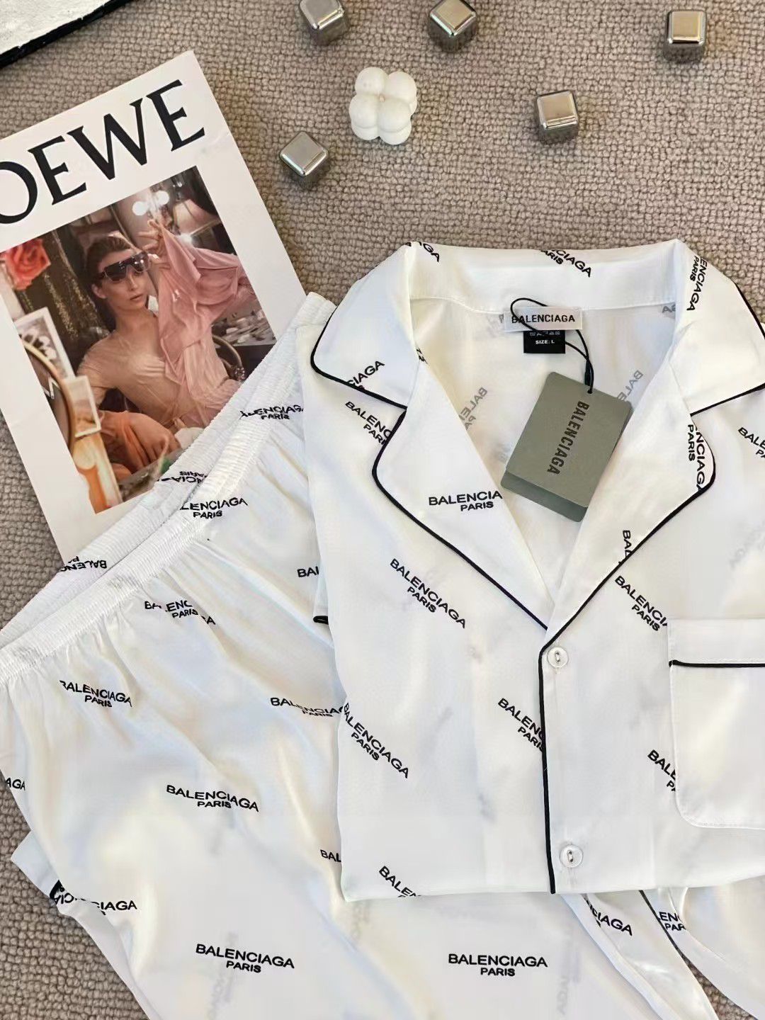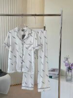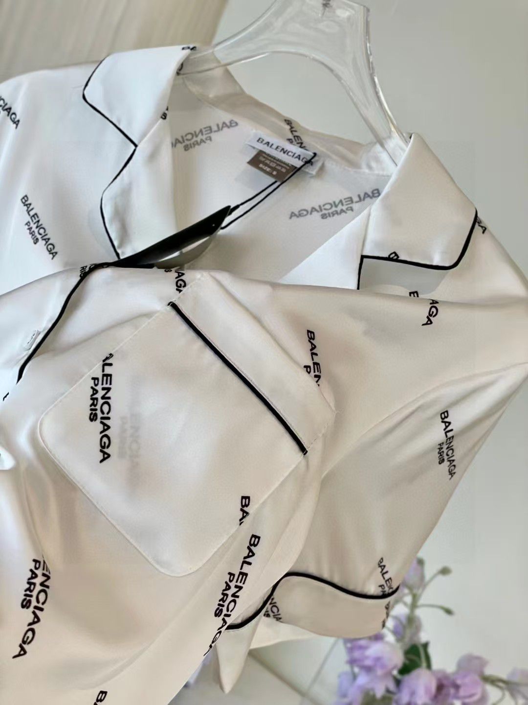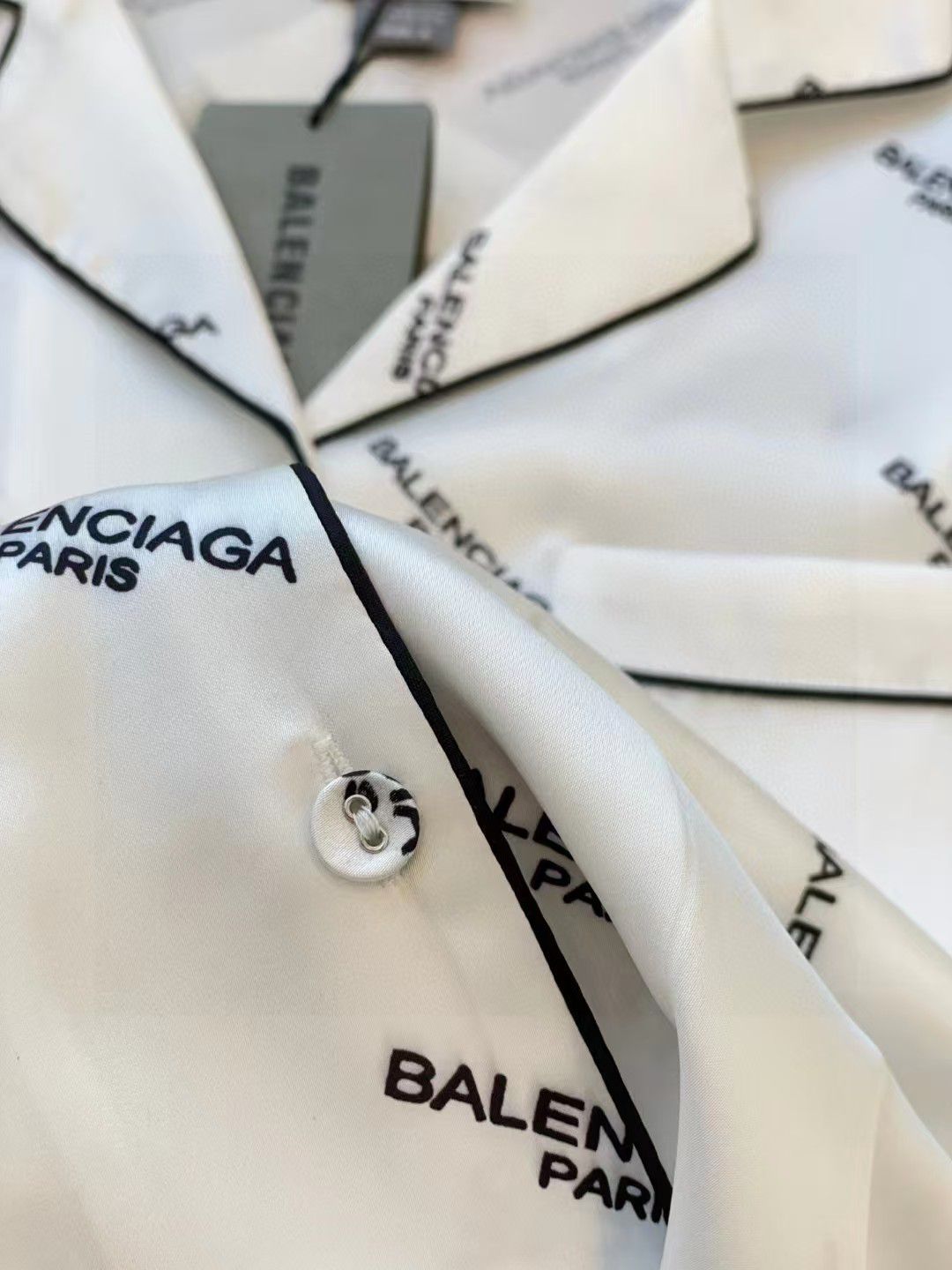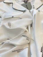 This Balenciaga white satin pajama set features the iconic 🎨 BRAND PRINT and sharp ⚫ CONTRAST PIPING! The perfect blend of high-fashion design and ultimate comfort for elegant relaxation! 💫
