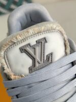 Louis Vuitton Distressed Grey Sneakers 👟 – Frayed denim meets luxury craftsmanship, a bold LV sneaker for streetwear lovers. Sizes US 7–14.