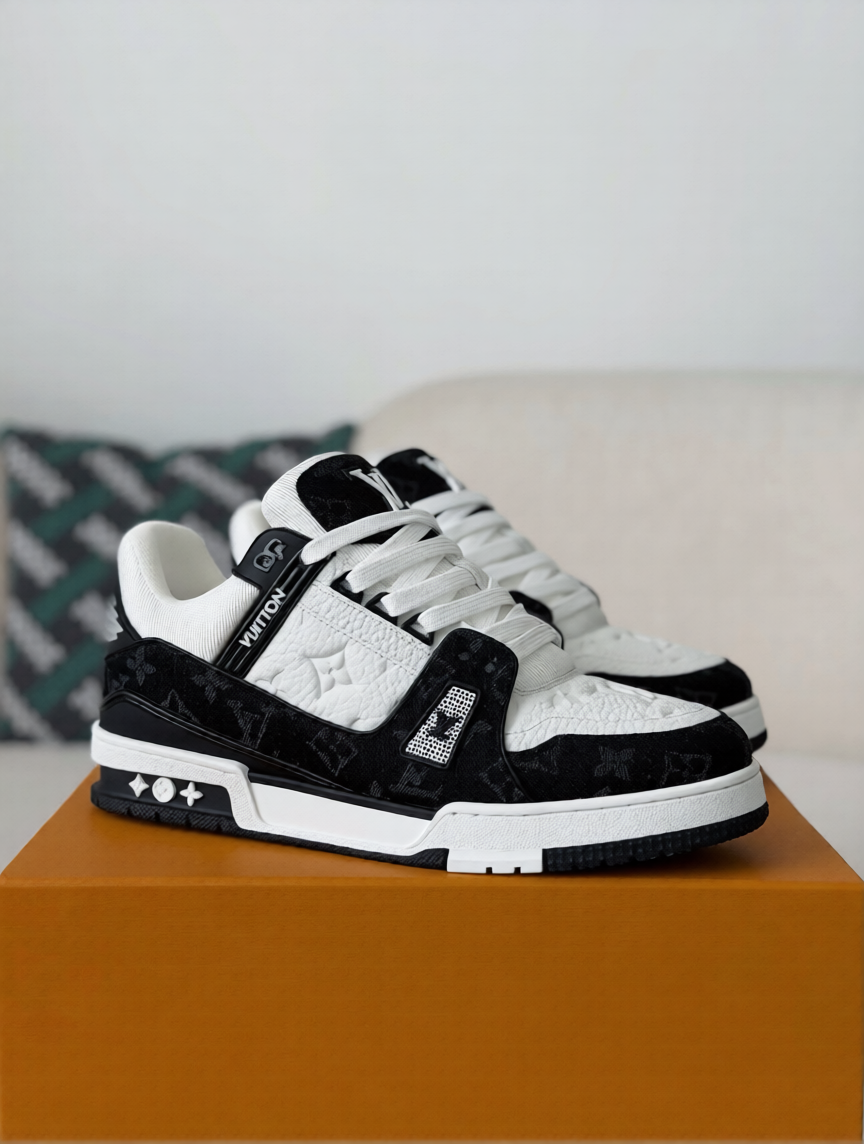 The Louis Vuitton LV Trainer Sneaker – White & Black Edition 🖤 is a bold expression of luxury streetwear. Crafted from premium calf leather and elevated with Louis Vuitton’s signature Monogram embossing, this exclusive pair stands out with its clean and striking white and black contrast.