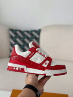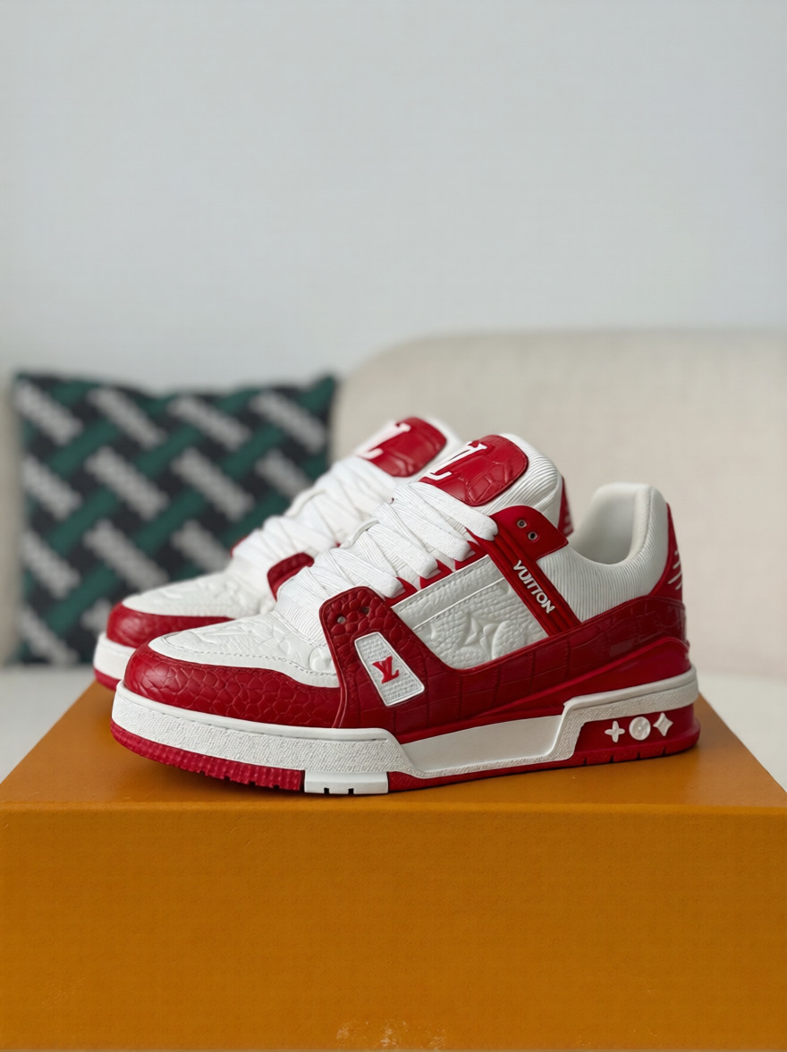 Exclusive Louis Vuitton Trainer in white & red leather. A luxury sneaker blending sporty style and premium craftsmanship. Sizes US 7–14.